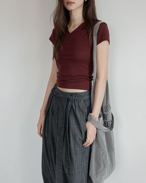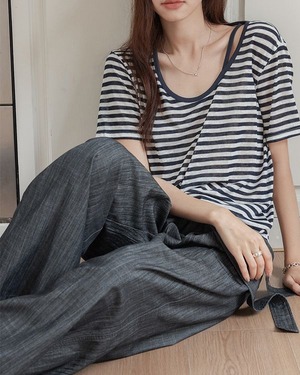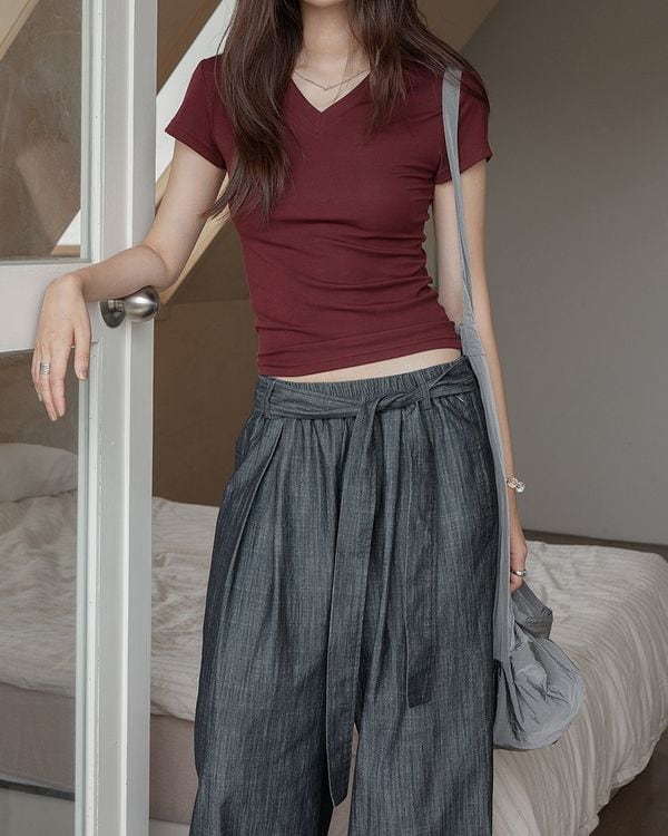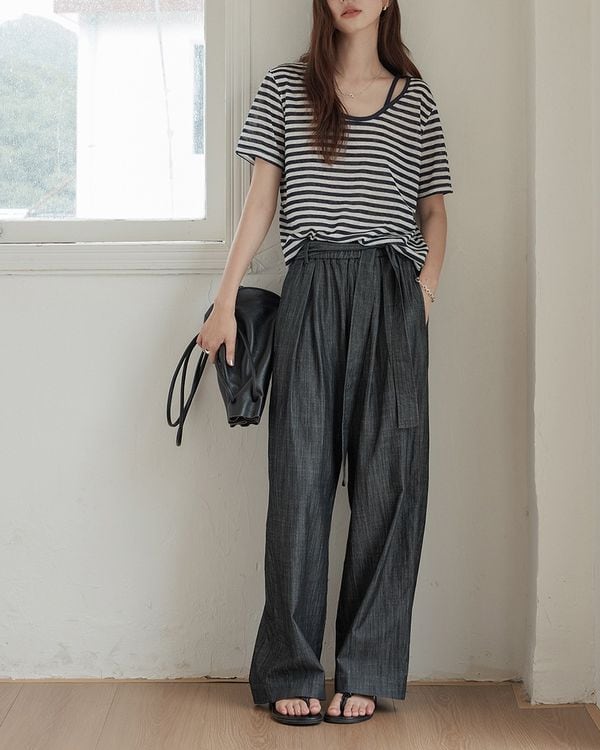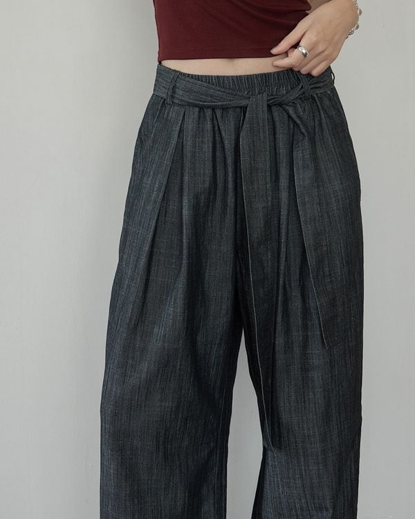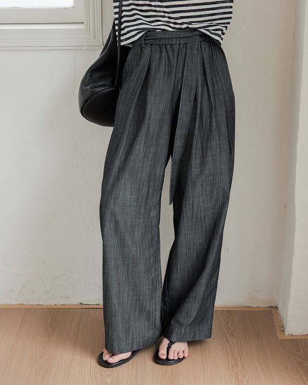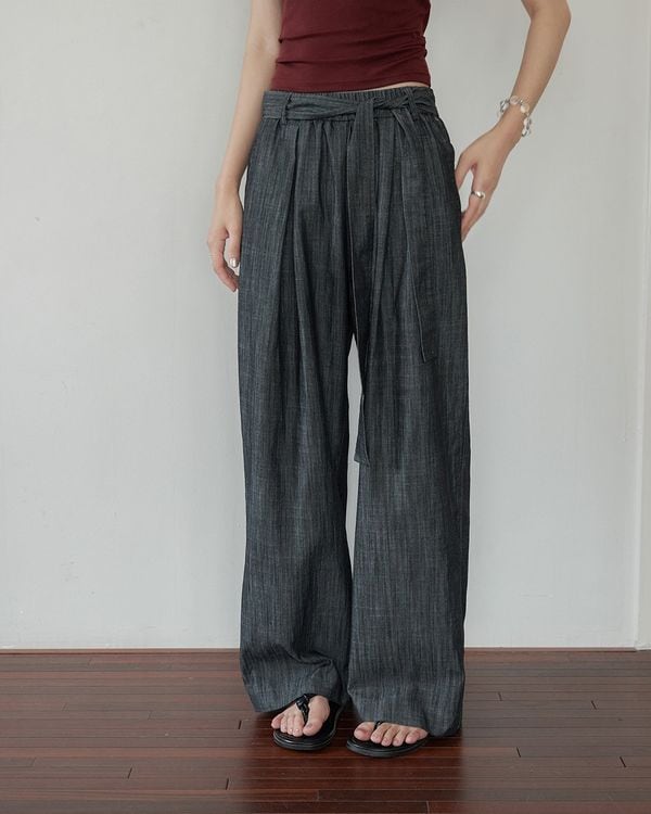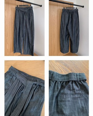 ウエストリボンがアクセントになったタックワイドパンツ。