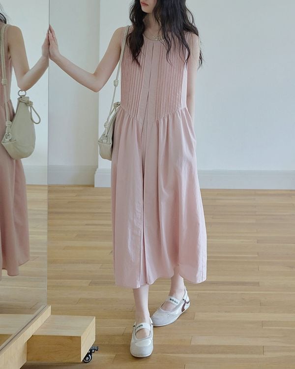 Aラインシルエットが女性らしいミディ丈ワンピース。