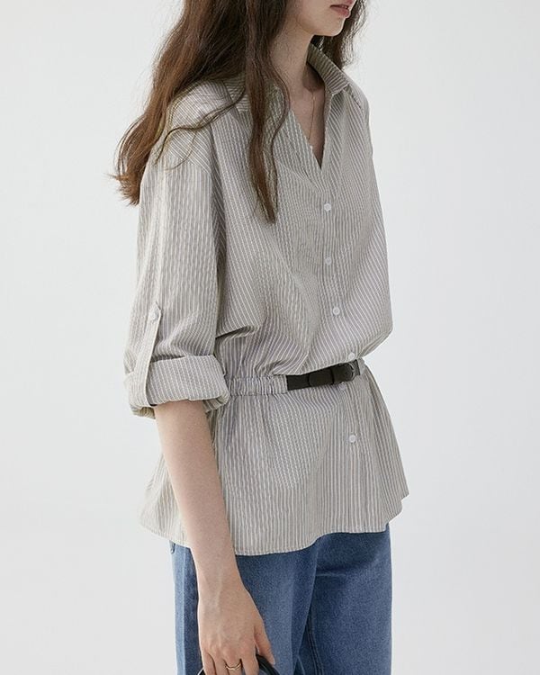 ストライプ柄が上品なベルト付きロングスリーブシャツブラウス。
