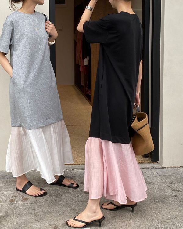 トップスのシンプルさと風になびくスカートの組み合わせが、