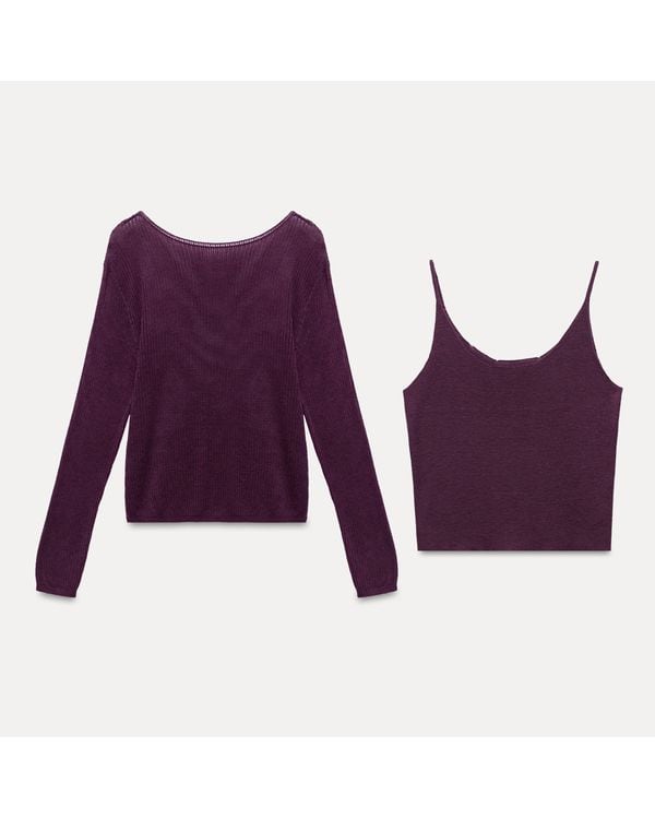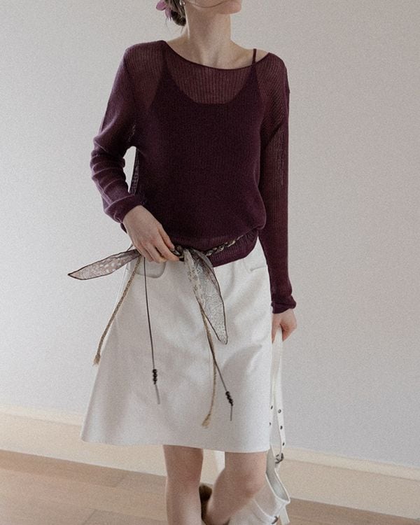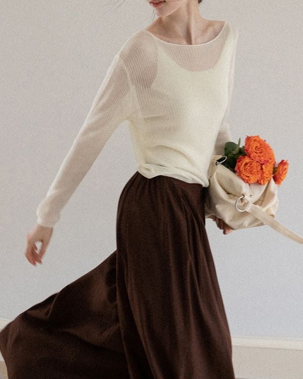 ボートネックのシアーニットロングスリーブトップスとニットキャミソールのセットアイテム。