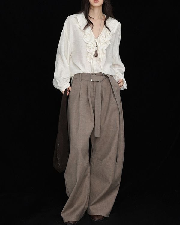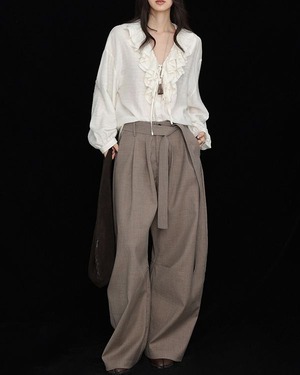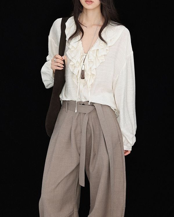 Vネックとフリルネックが、女性らしさを引き立てます。