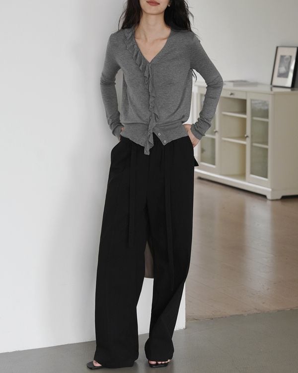 Vネックとフリルディテールのロングスリーブニットカーディガン。