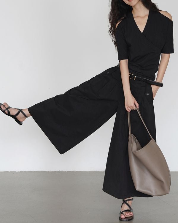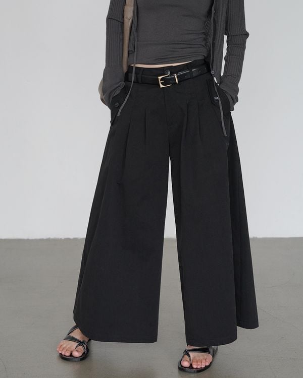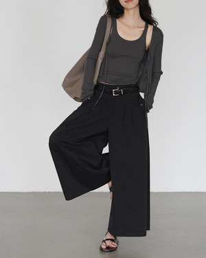 腰回りはすっきりと、裾にかけて広がるワイドシルエットが、美脚効果とこなれ感を演出します。