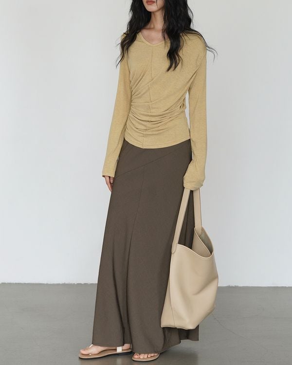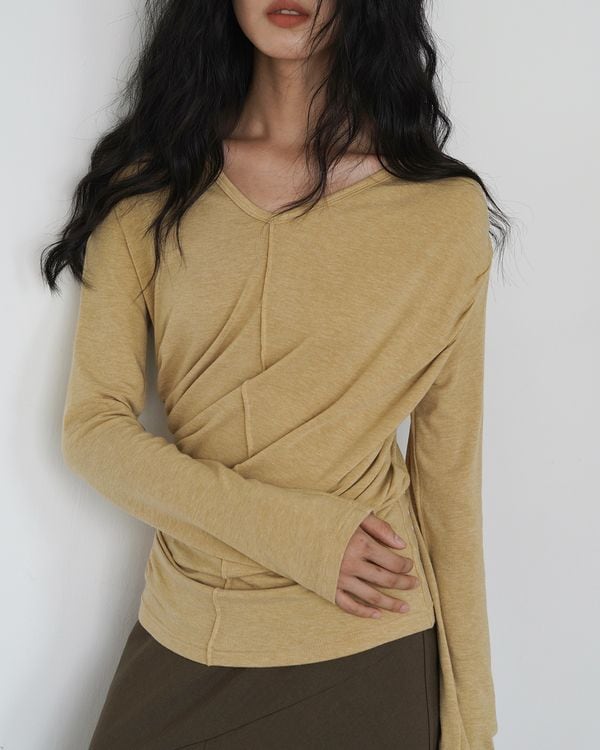 Side gathered v-neck long sleeve top ◇2color TH3557