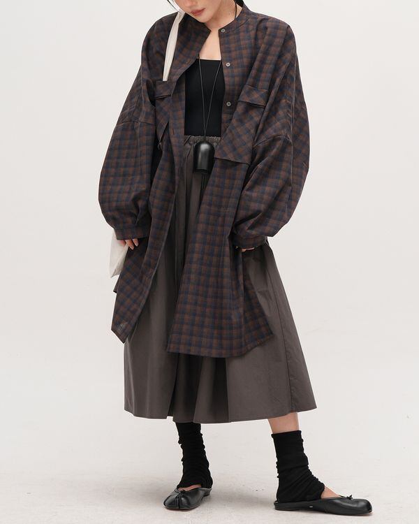 オーバーサイズでロング丈のスタンドカラーシャツワンピース。