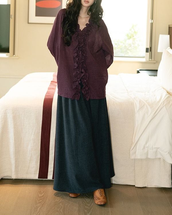 センターにあしらわれたフリルは、上品で華やかな印象を与え、特別な日にふさわしい一枚です。
