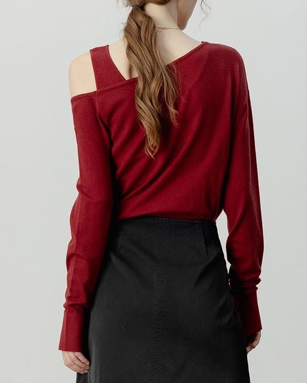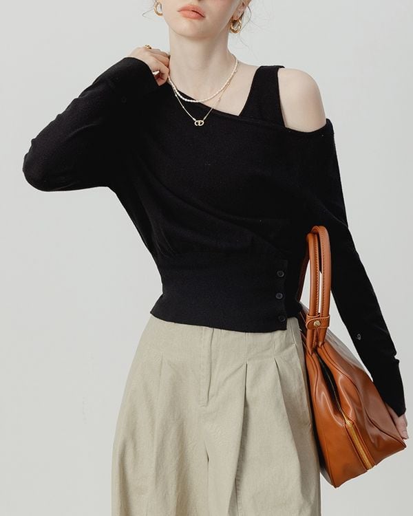 ワンショルダーデザインが目を惹くクロップドニットトップス。