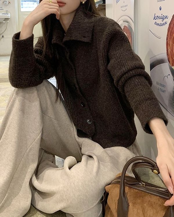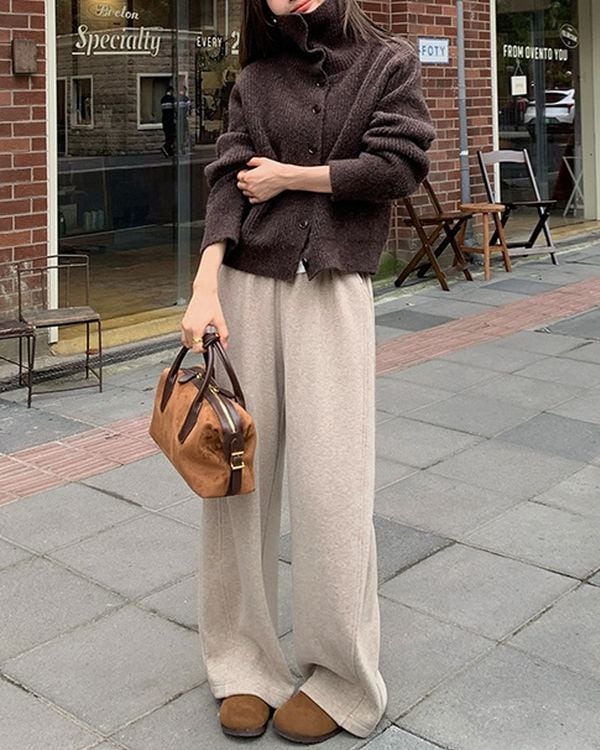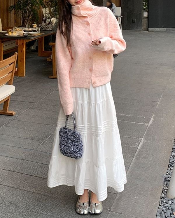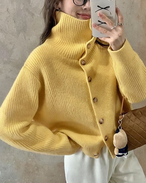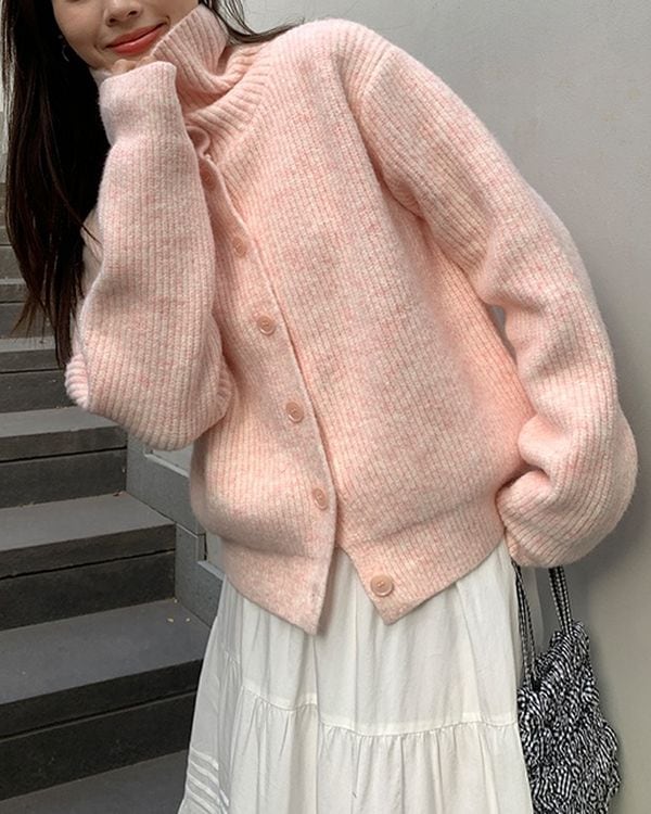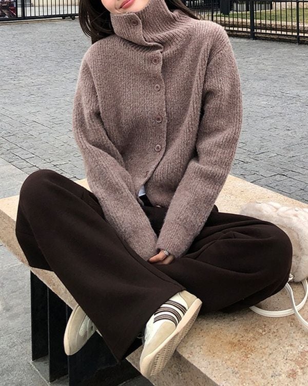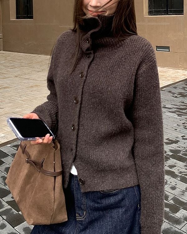 ハイネックデザインが首元まで暖かく包み込むニットカーディガン。