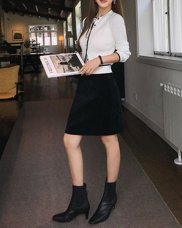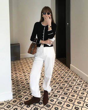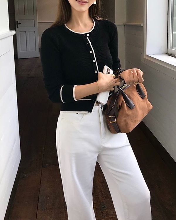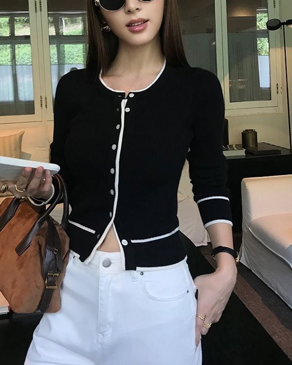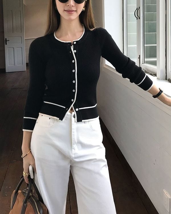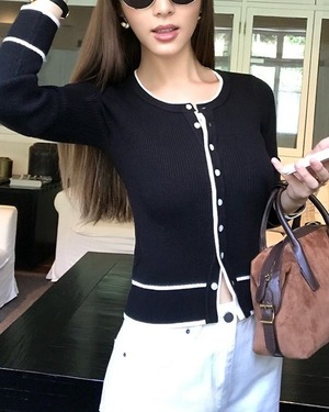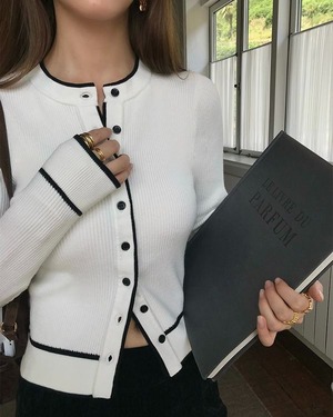 シンプルながらコントラストラインが目を惹くカーディガン。
