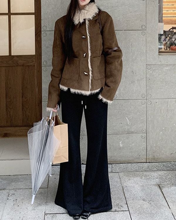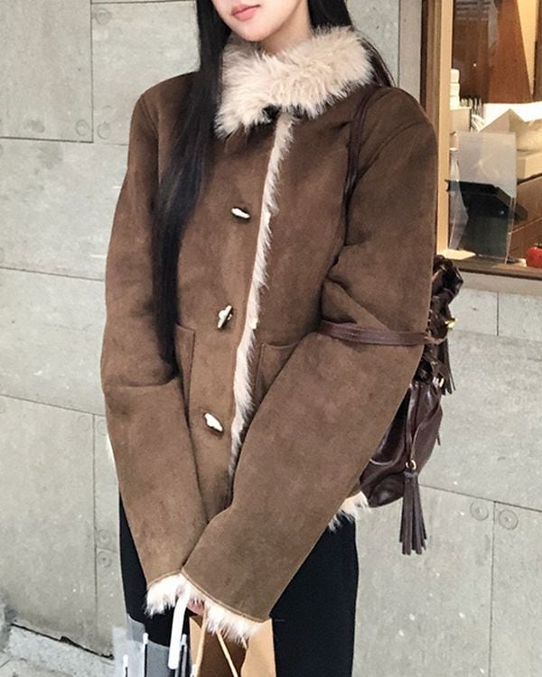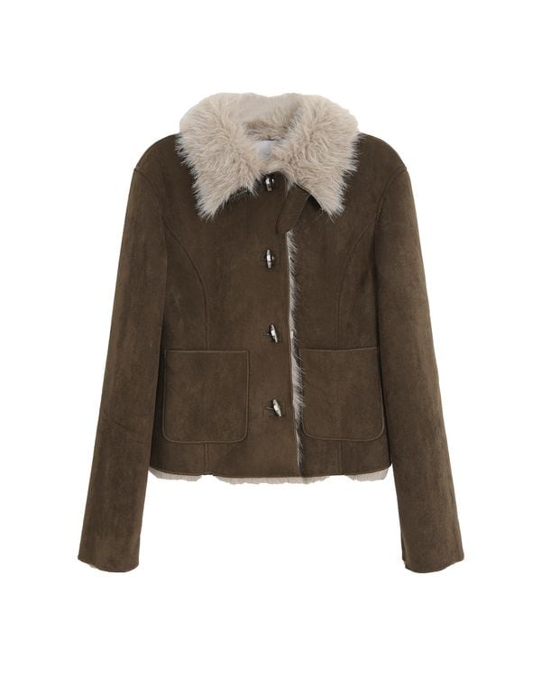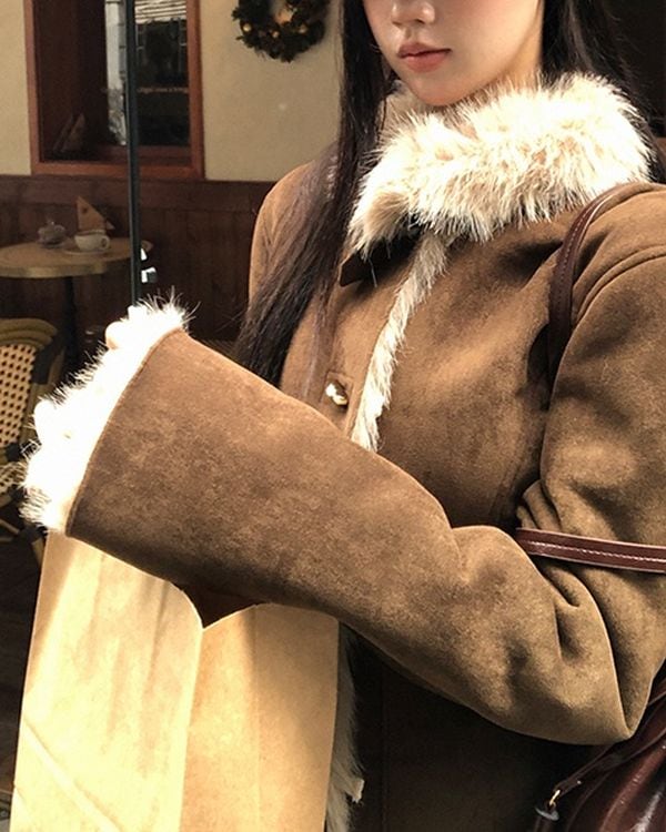 ファーカラーが目を惹く、スエードジャケット。