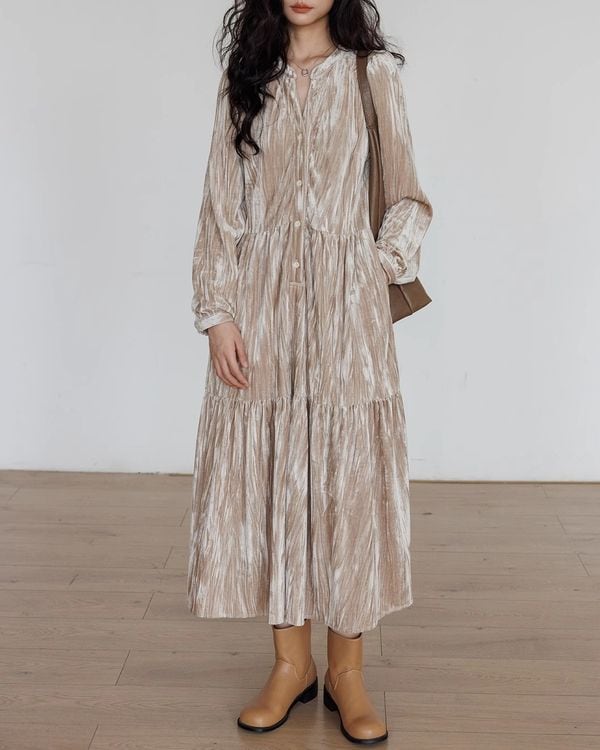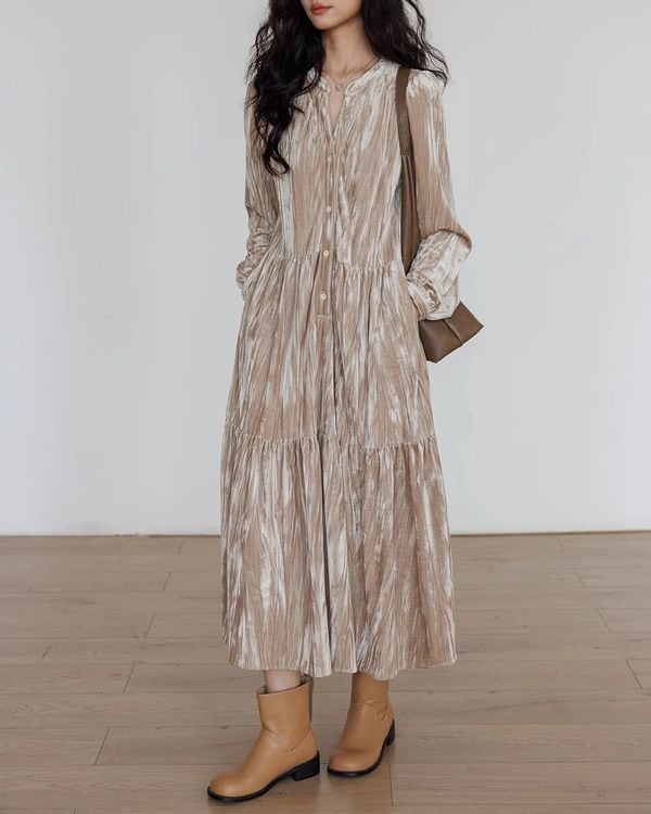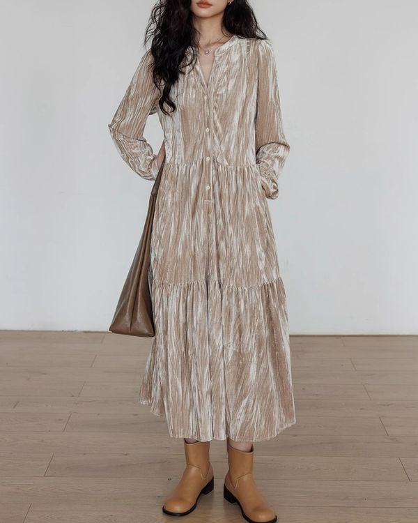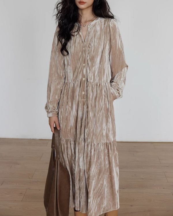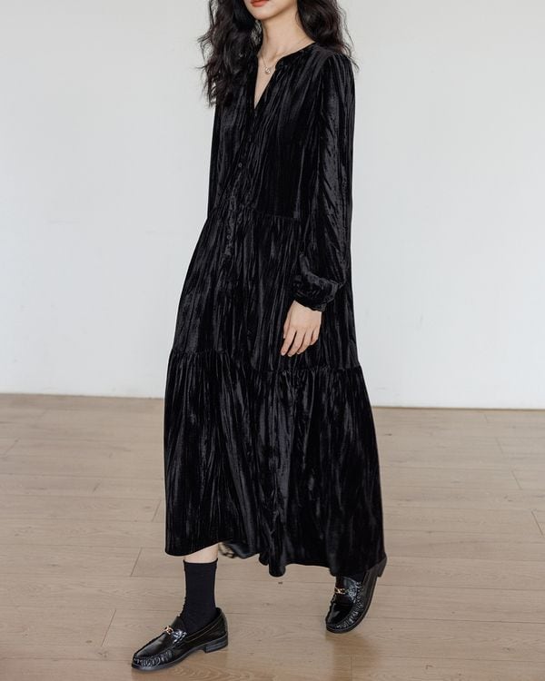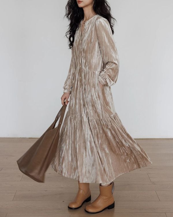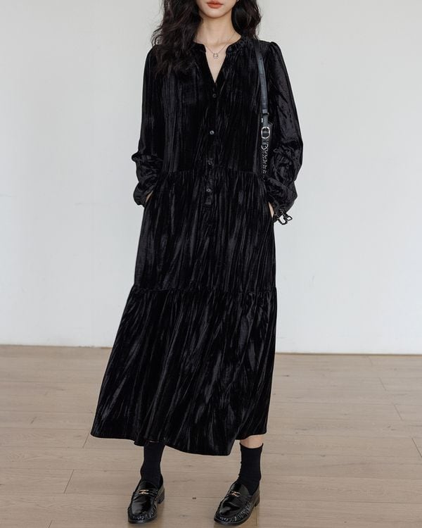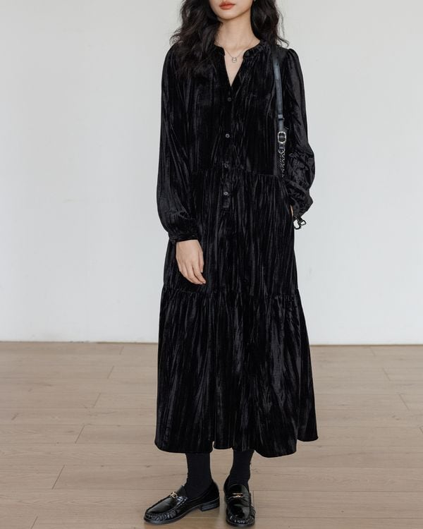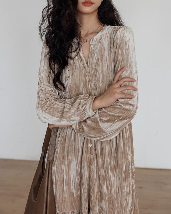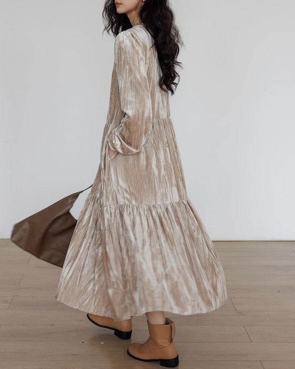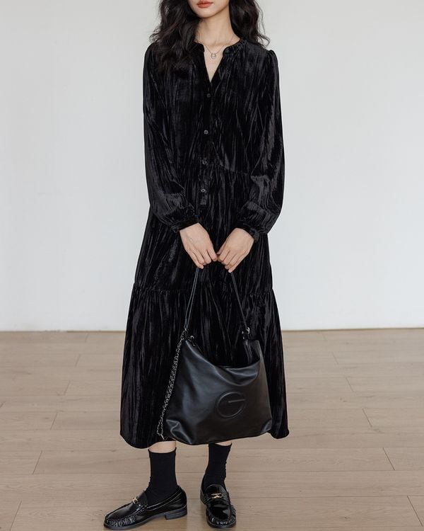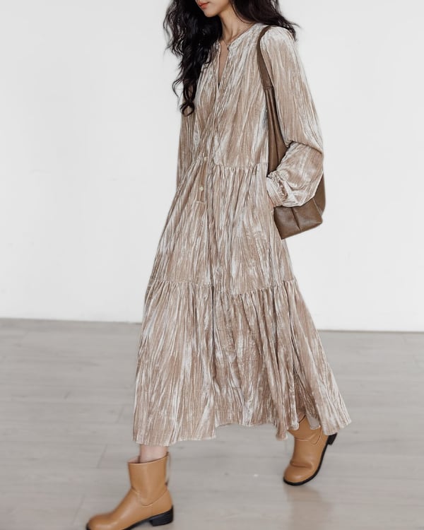 着るだけで上品な印象になる長袖ベロアワンピース。