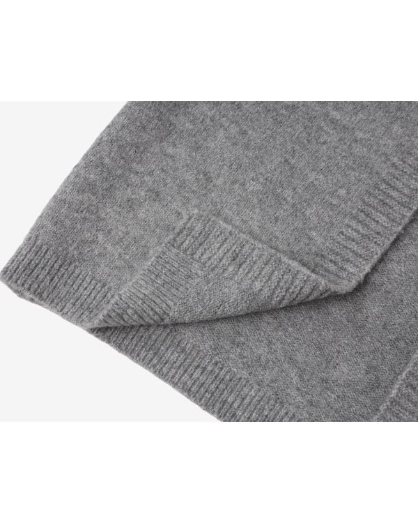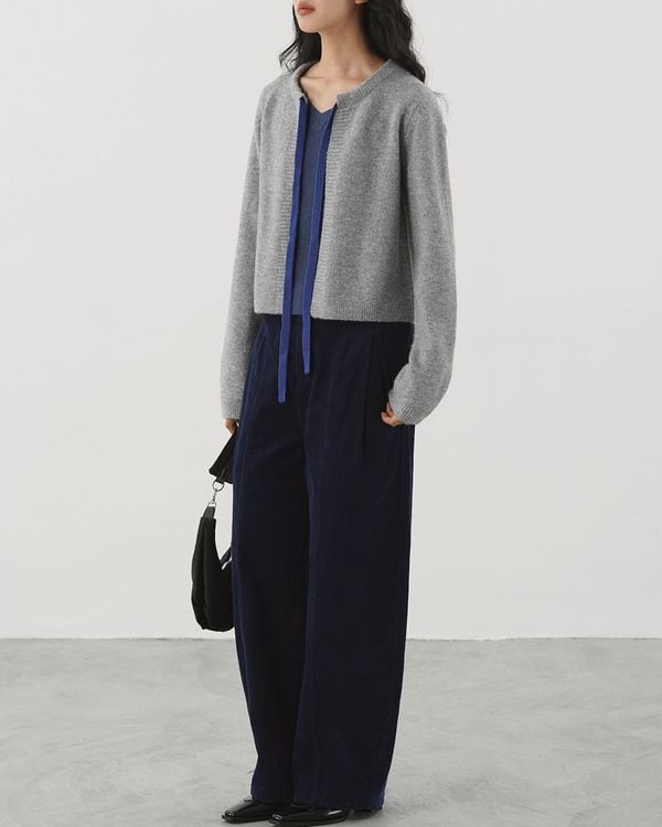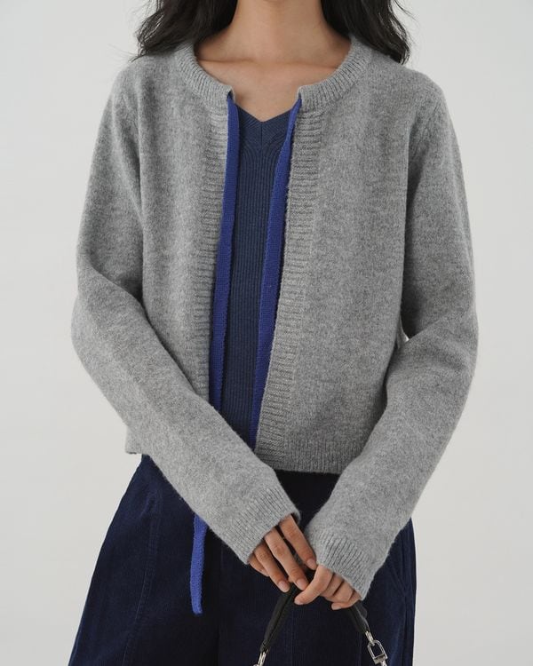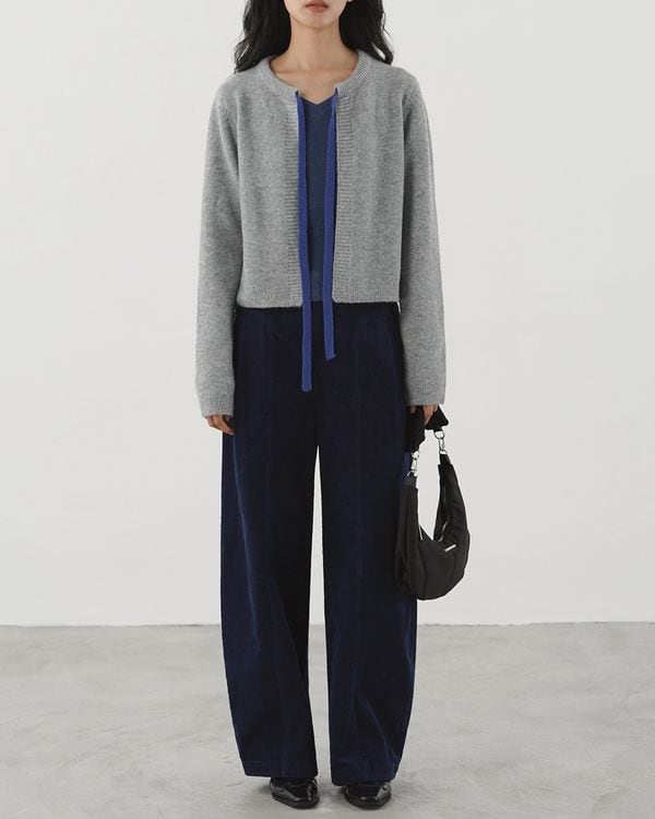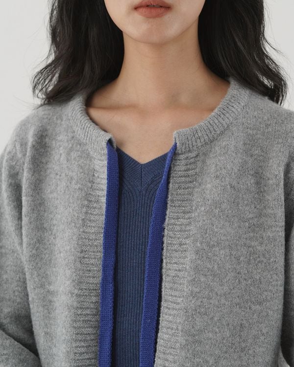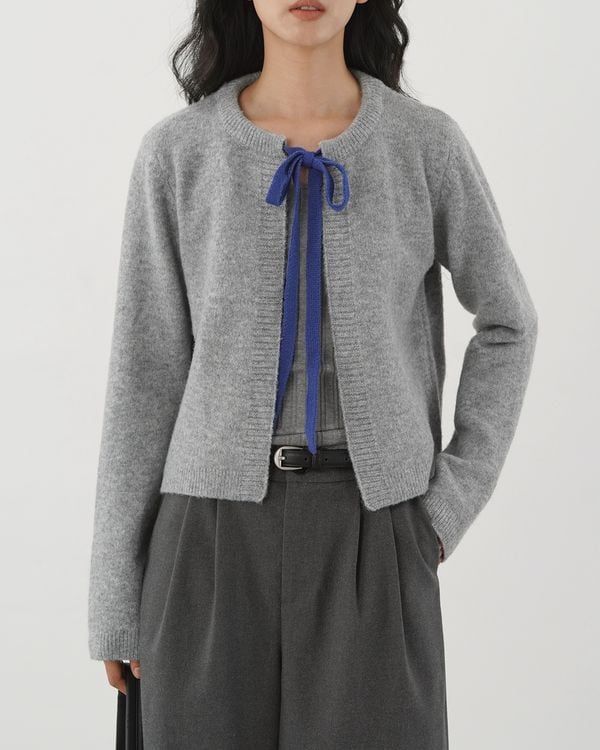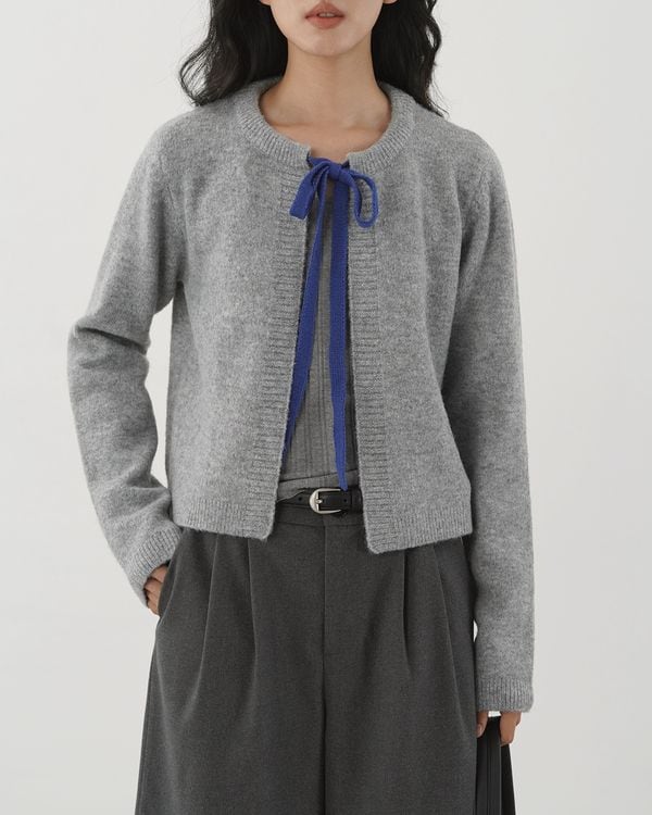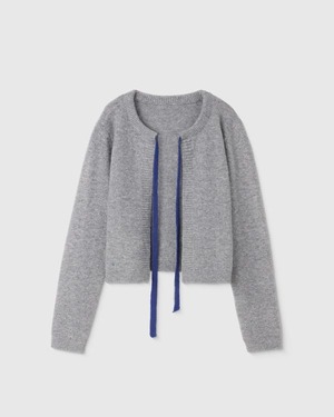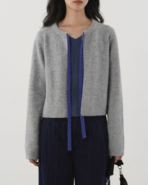 コントラストリボンが目を引くノーカラーのニットカーディガン。