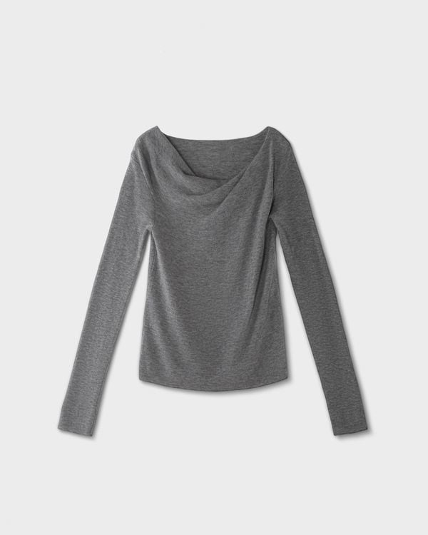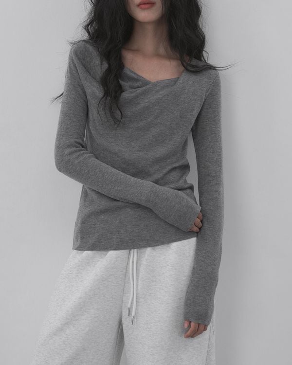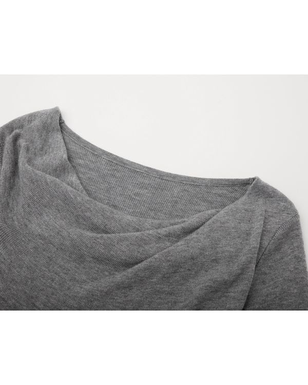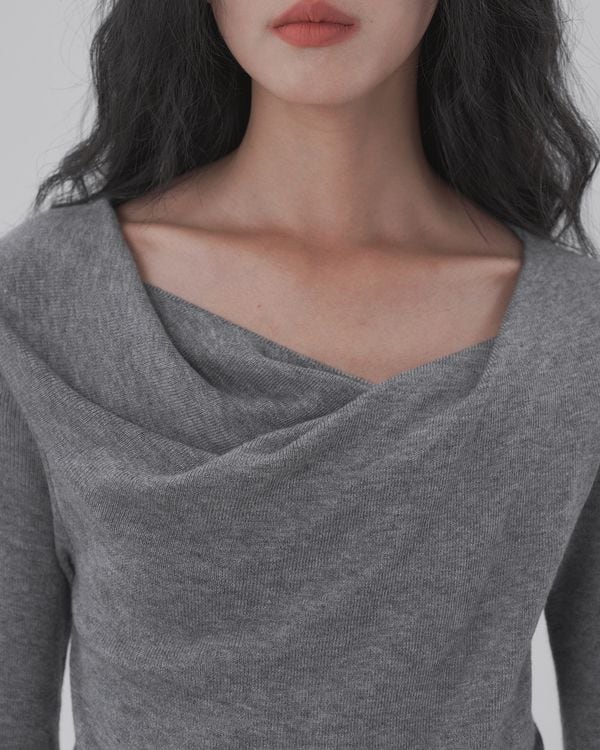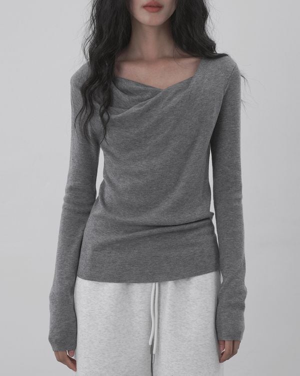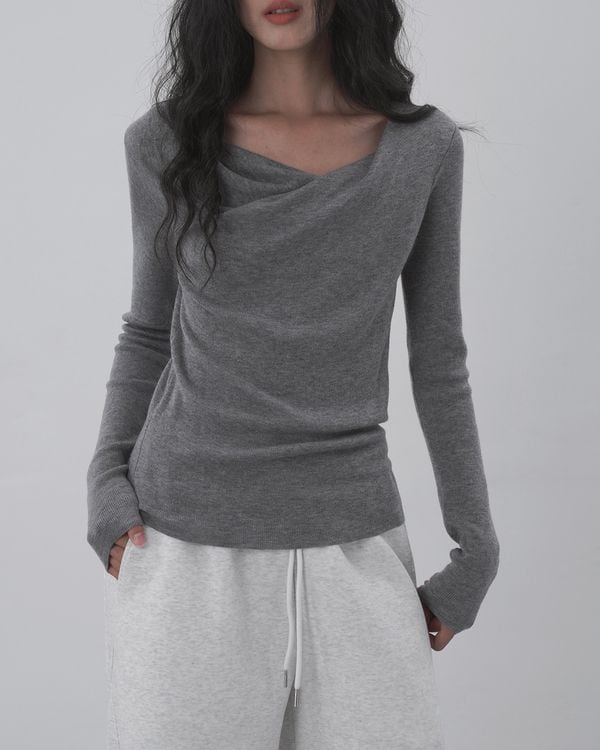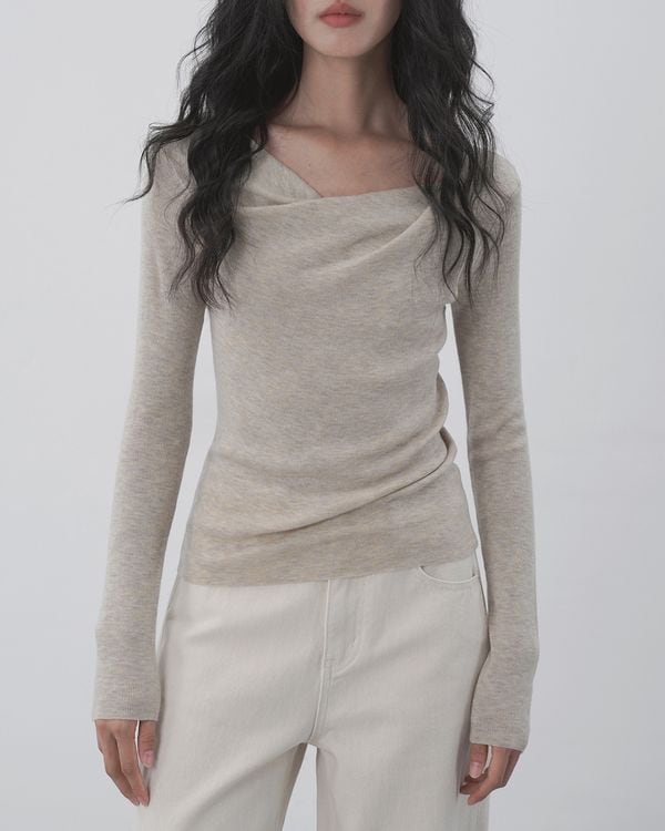 ツイストドレープネックが女性らしさを引き立てる長袖ニット。