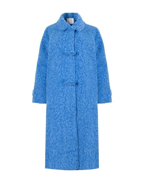 色鮮やかなブルーが目を惹くロングコート。