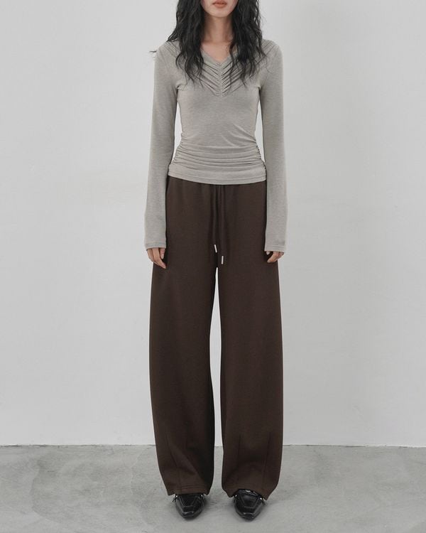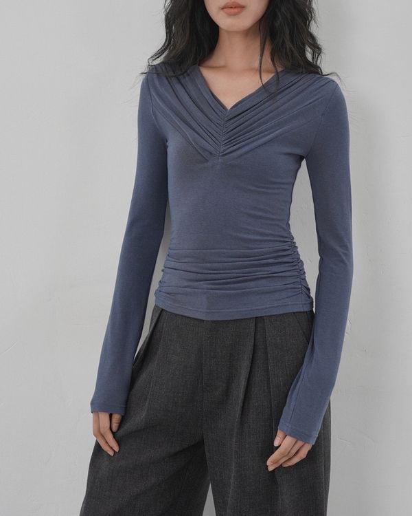 Gathered v-neck long-sleeve top ◇2color TH3669