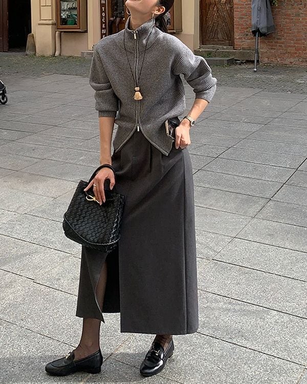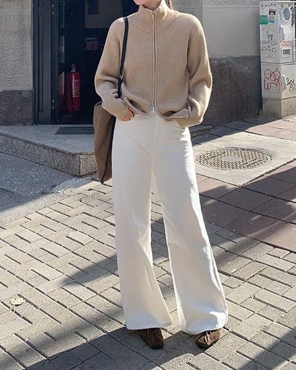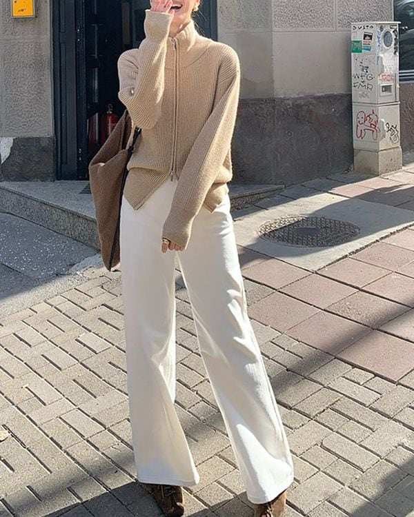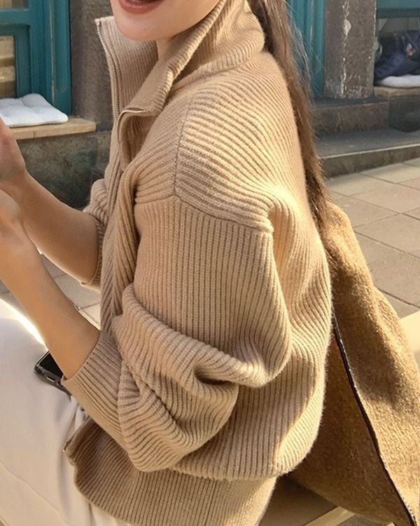 シンプルながらも上品な印象のジップリブニットカーディガン。