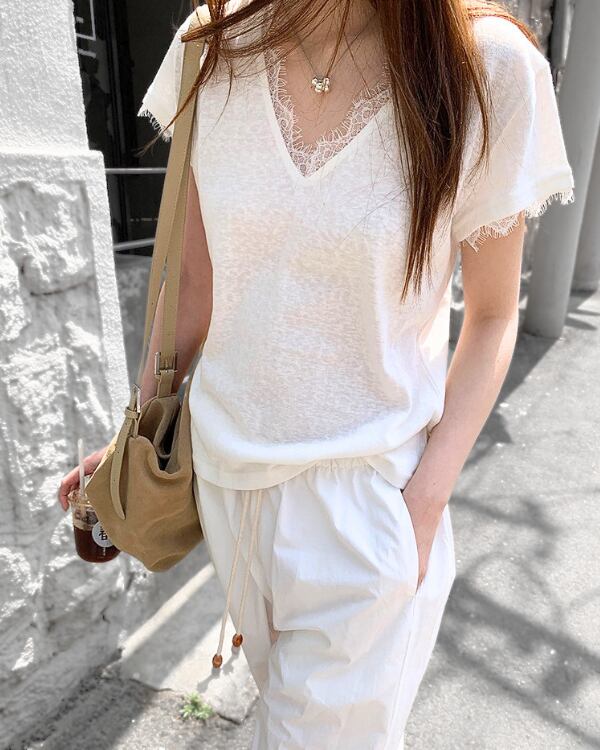Vネックとレースの組み合わせが女性らしさを引き立てる一枚。